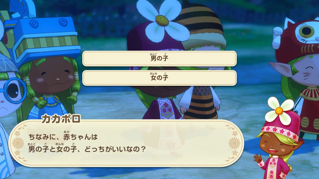 以上3つの条件を満たすと、起床時にイベント「コロボックルのお告げ」が発生します。このイベントでコロボックルたちに赤ちゃんがやってくると告げられ、性別はどちらがいいか聞かれます。