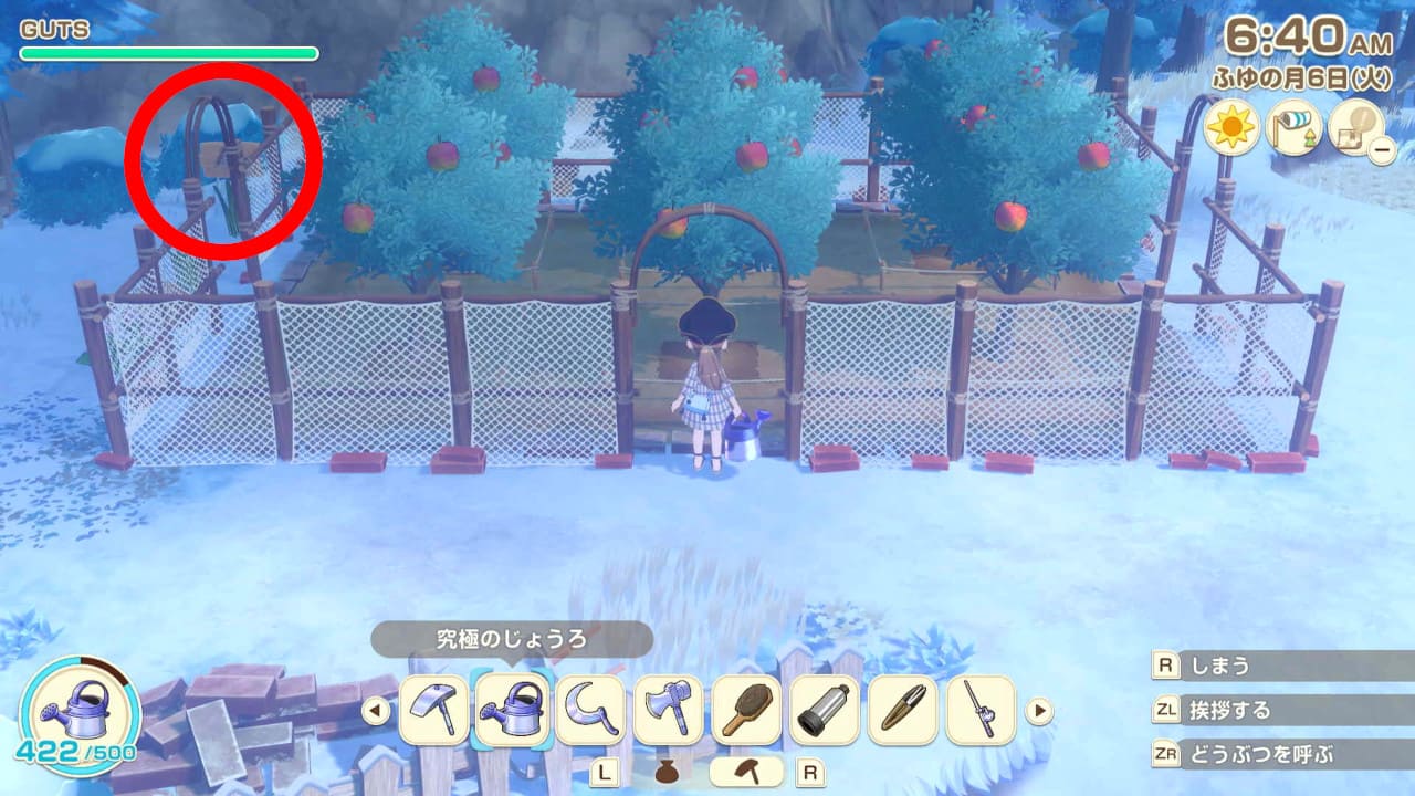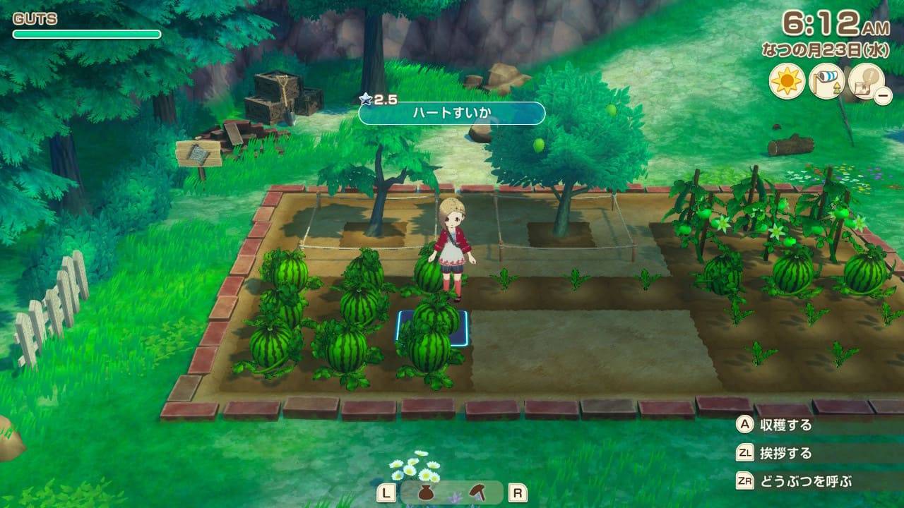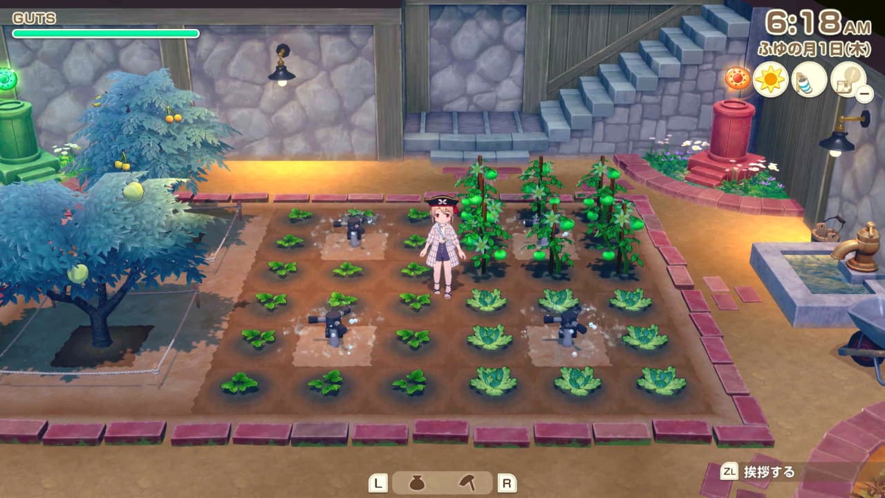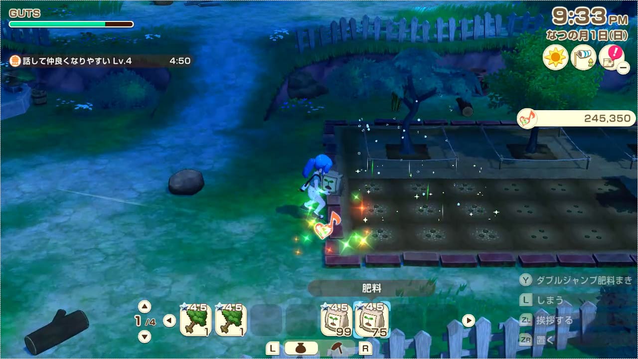 GUTSとは主人公の行動力を示しています。農作関連では道具を使用した時にGUTSを消費します。ジャンプアクションは広範囲を作業できますが、通常アクションより消費量が大きくなります。