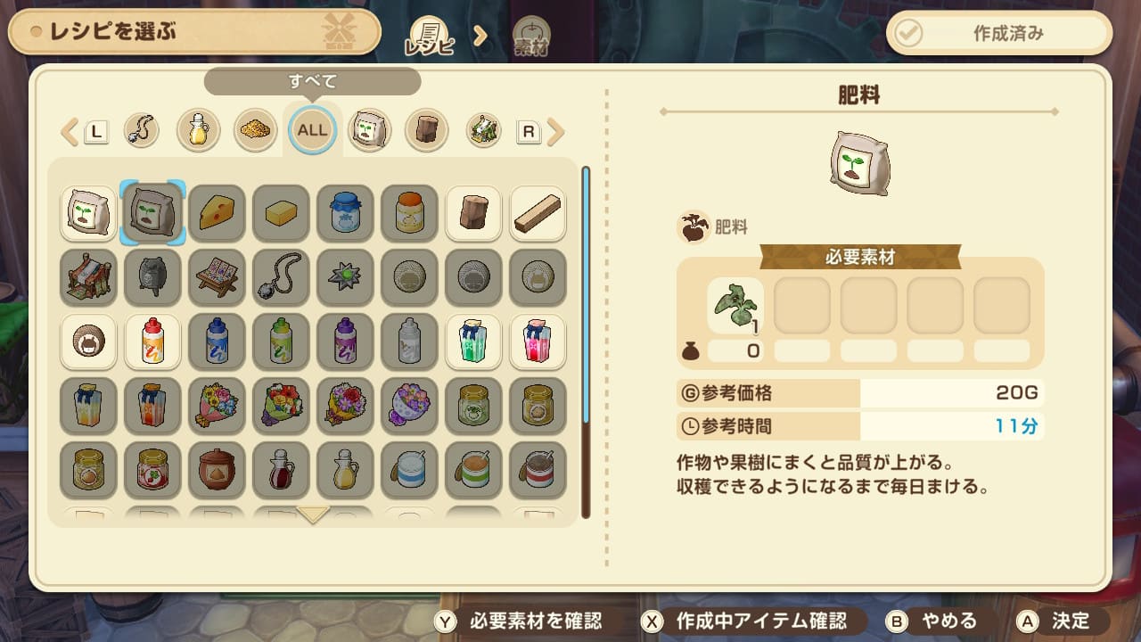 アイコンと表示メッセージでだいたいの鮮度が分かるようになっています。鮮度値が0になると腐ってしまい、売ることも食べることも出来なくなるので、その前に売るか、料理か加工に使って新鮮さをリセットしましょう。