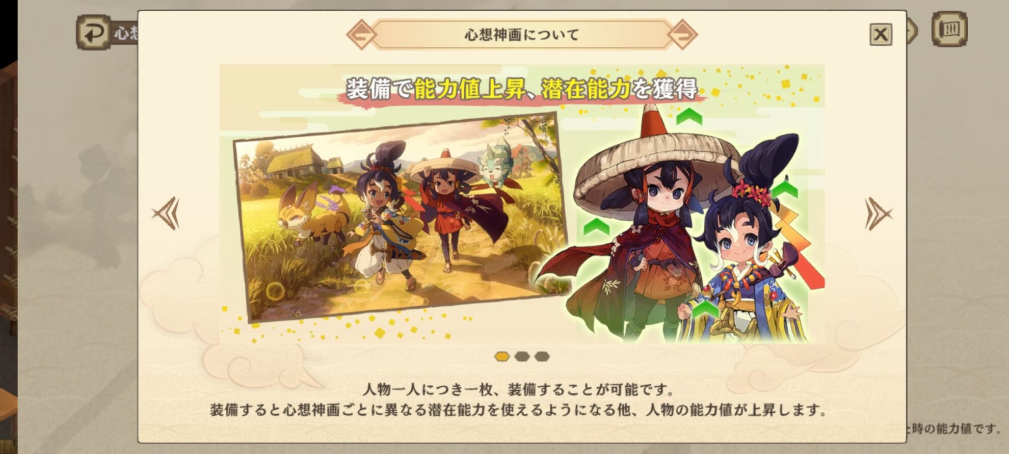 人物1人につき1枚、付けることができる装備。装備すると心想神画ごとに異なる能力値上昇、潜在能力を獲得します。 - 上限突破