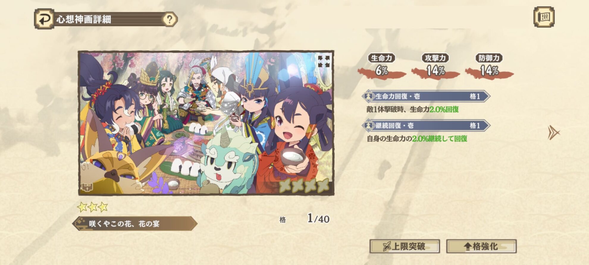 ▲事前登録者数20万人達成記念で配布されている心想神画「咲くやこの花、花の宴」、これの生命力回復が非常に役立つというか、ほぼ必須です。心想神画はまず「咲くやこの花、花の宴」を強化して必ず編成してください。