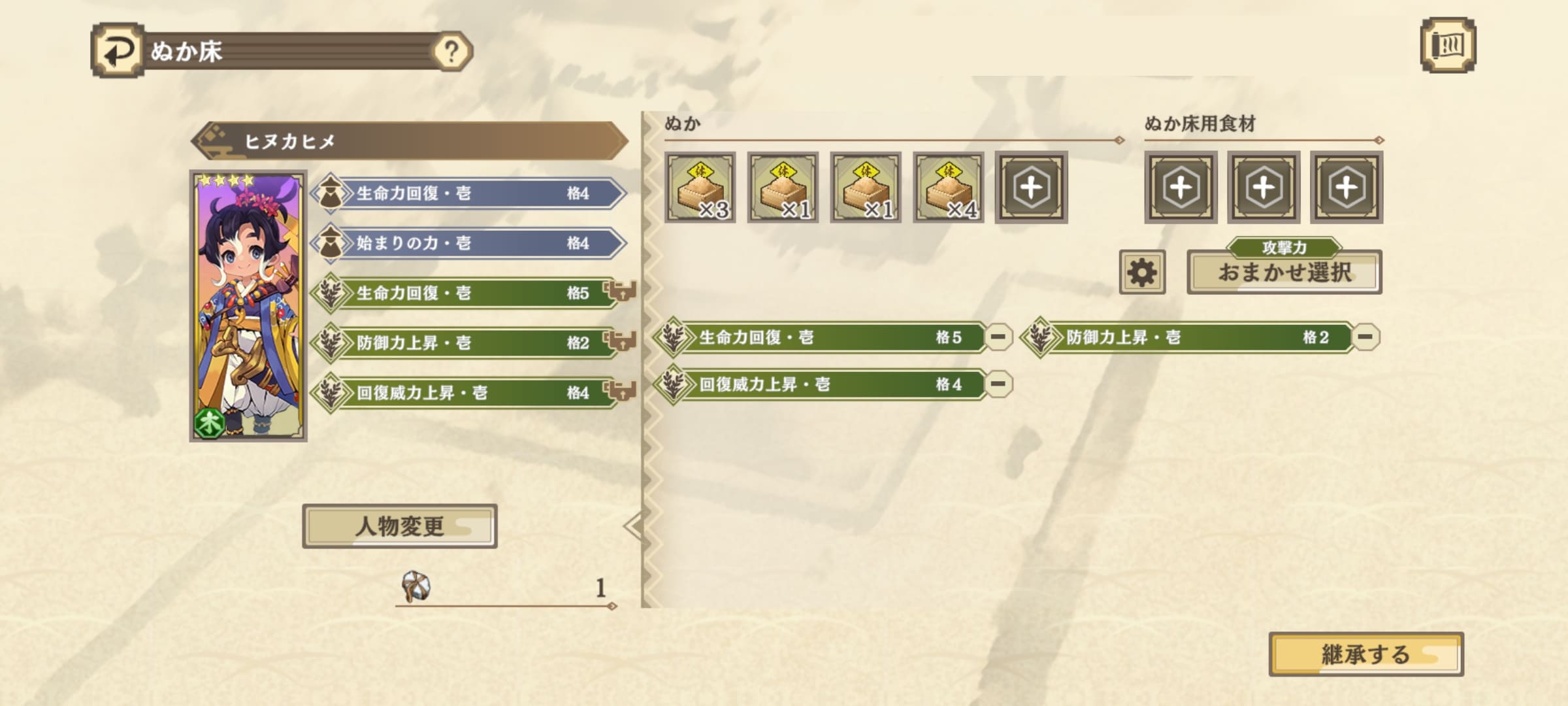 稲作完了時に、稲作に編成していた人物と助っ人の固有潜在能力が最大8つまで抽選され、「ぬか」になります。この「ぬか」を使用して、別の人物が持つ潜在能力を継承するのが、ぬか床継承です。