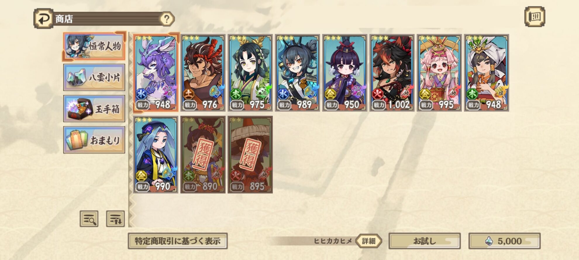 - 欲しいキャラの能力が上がる心想神画を、引き直しガチャで厳選する
