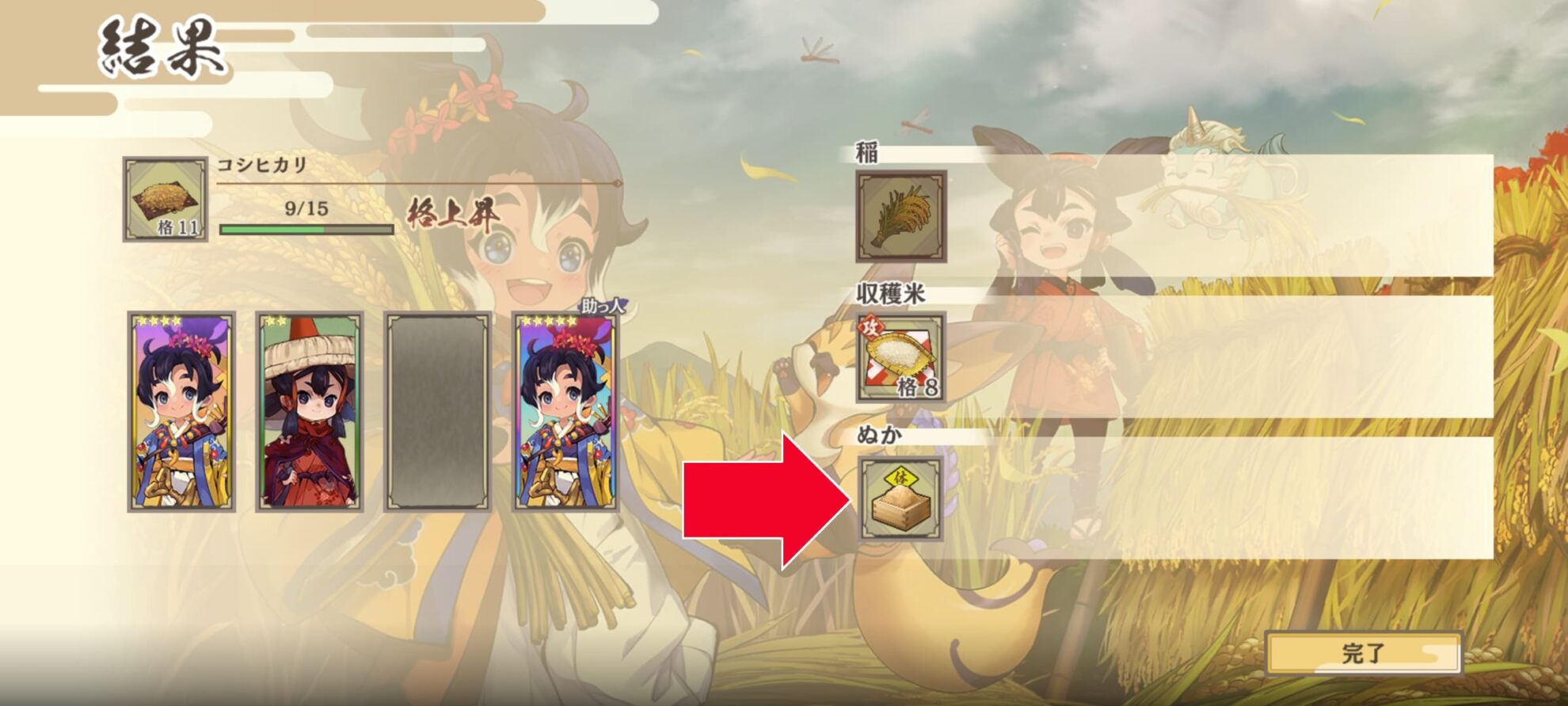 また、ぬか床の潜在能力格や抽選確率を操作できる道具(食材)が存在しますが、序盤はまず稲作を繰り返して田んぼの格と品質を上げ、1つでも多くのぬかを手に入れてぬか床継承でキャラクターを強化しましょう。