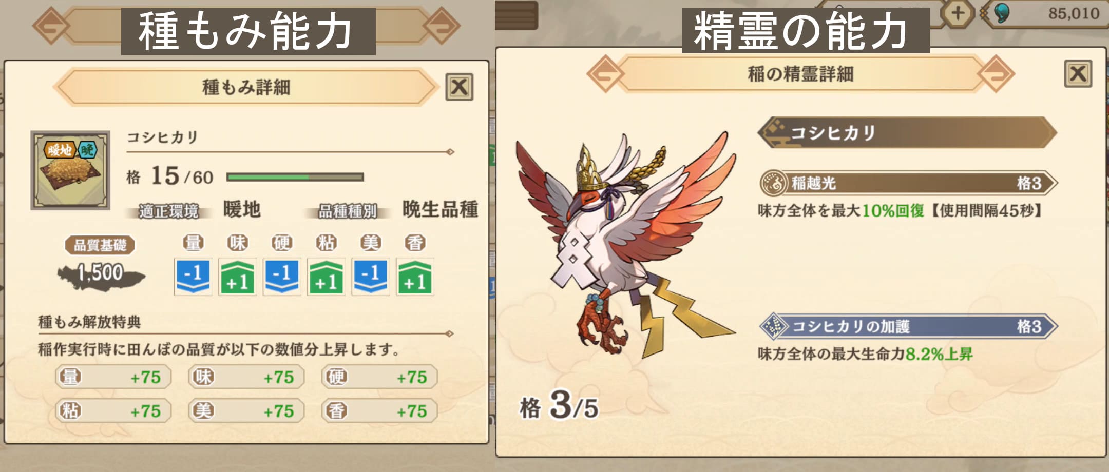 稲作を重ねると、使用した種もみに宿る精霊の格が上昇し、米の品質と固有潜在能力の両方が高まります。最初は戦闘に役立つ能力を持つ種もみを育てましょう。