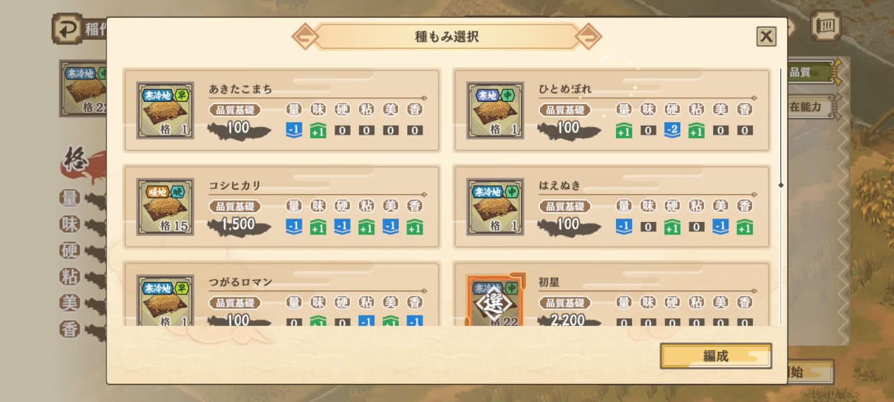 コシヒカリ、あきたこまち、初星など、物語や探索中に見つかる種もみと、配合所で「配合」して手に入れる種もみがあります。配合所の家系図を開いて、配合できる種もみの解放条件と必要素材を確認してください。