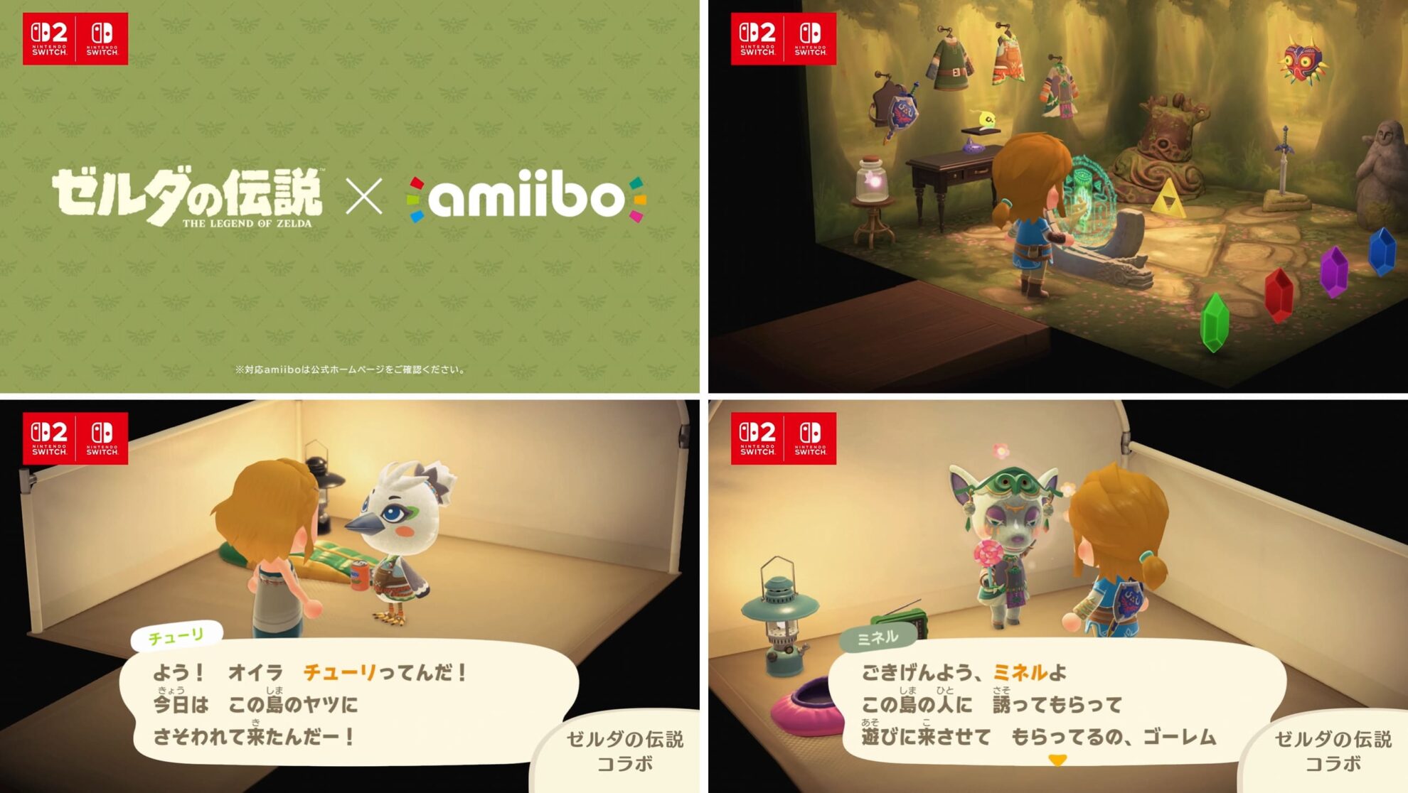 ゼルダの伝説シリーズのamiiboを使えば、ゾナウの認証紋や、ゼルダの伝説の家具、リンクやゼルダ姫のなりきり衣装が使えるようになります。さらに新住民として、ゼルダの伝説に登場するチューリや、ミネルが、キャンプ場に遊びに来てくれるようになります。もちろん島に勧誘することも!