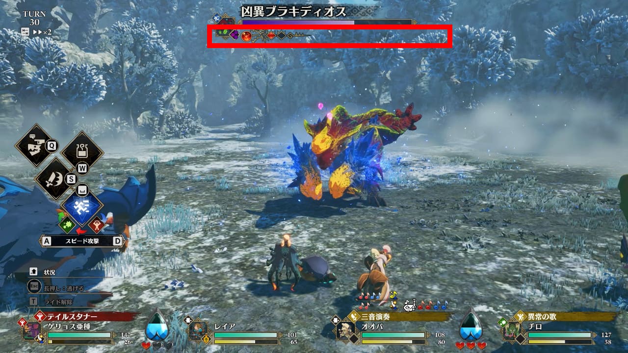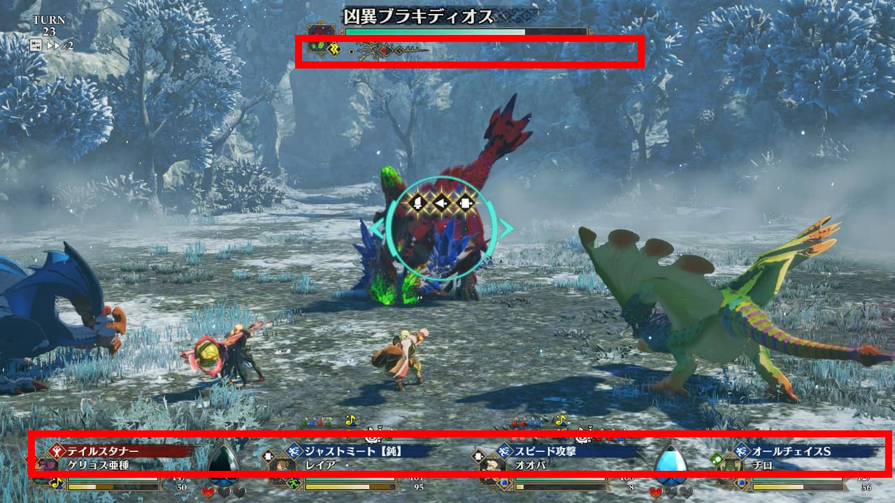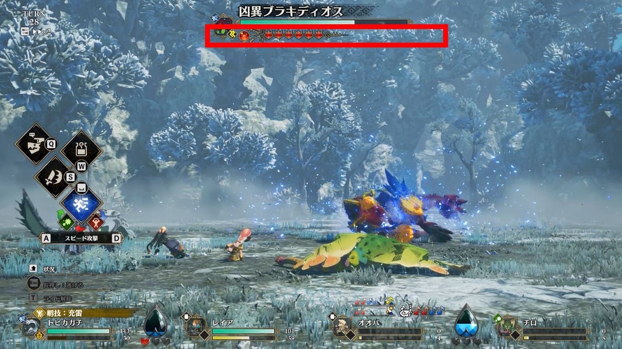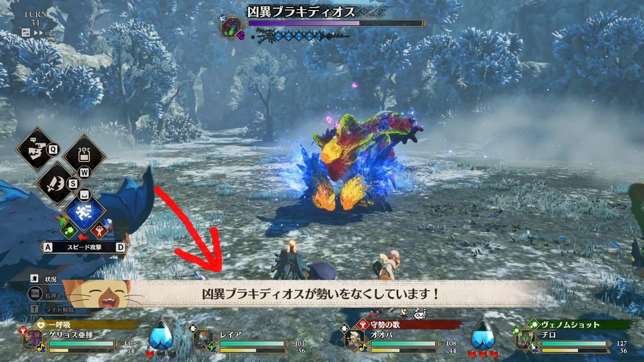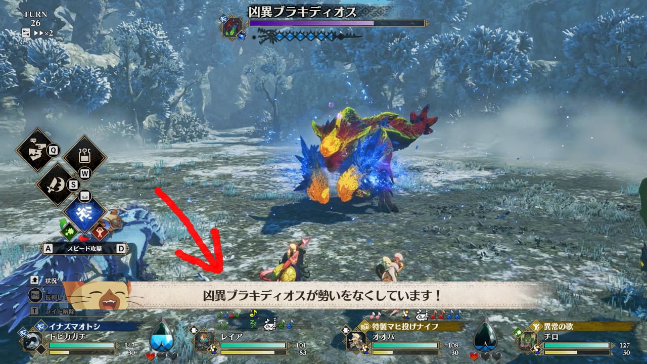 状態が変化した最初のターンは必ず単体攻撃です。攻撃の矢印に気を付けて行動を選択してください。勢いをなくしたターンでは、凶異ブラキの攻撃は全て外れます。余裕をもって行動できるチャンスです。
