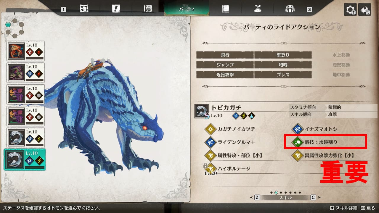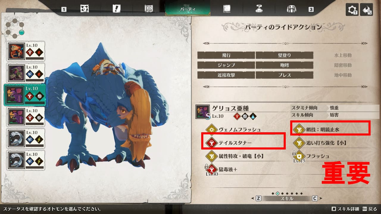 今回の主力②。1体目ゲリョス亜種がスタミナ切れで厄石に通常攻撃を仕掛けて反射で勝手に死ぬのを防ぐため、同じ毒×水の2体目を用意しました。うまく立ち回って2体の絆技を交代で出せるようにしておきたい。