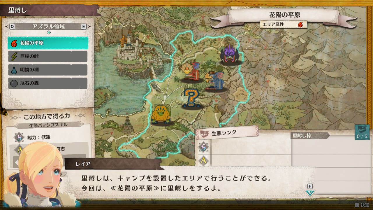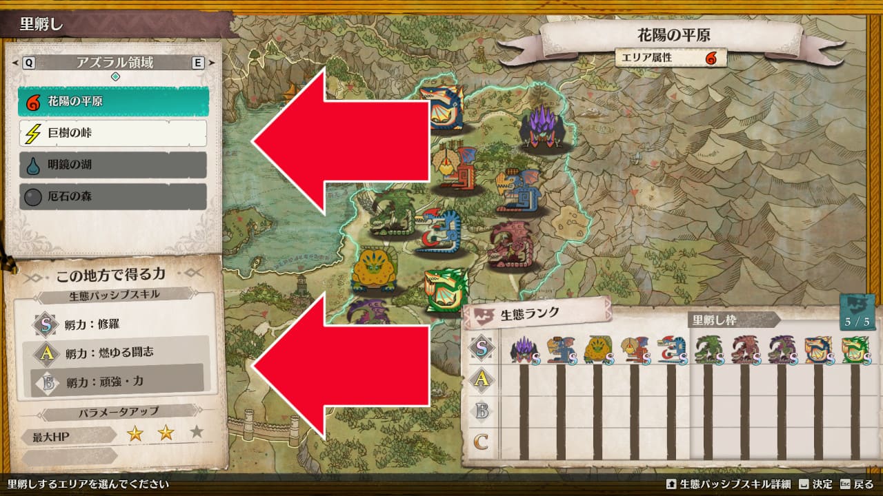 エリアによって見つかるタマゴは決まっていますが、里孵し枠を使用することで、新たに5種類のモンスターの生態ランクを追加することができます。