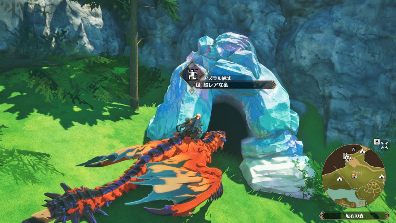 ▲超レアな巣が確定している場所もあります。ここは街を出入りしても、中のタマゴを取った後も、超レアな巣として出現し続けます。アズラル領域の超レアな巣は、厄石の森にあります。