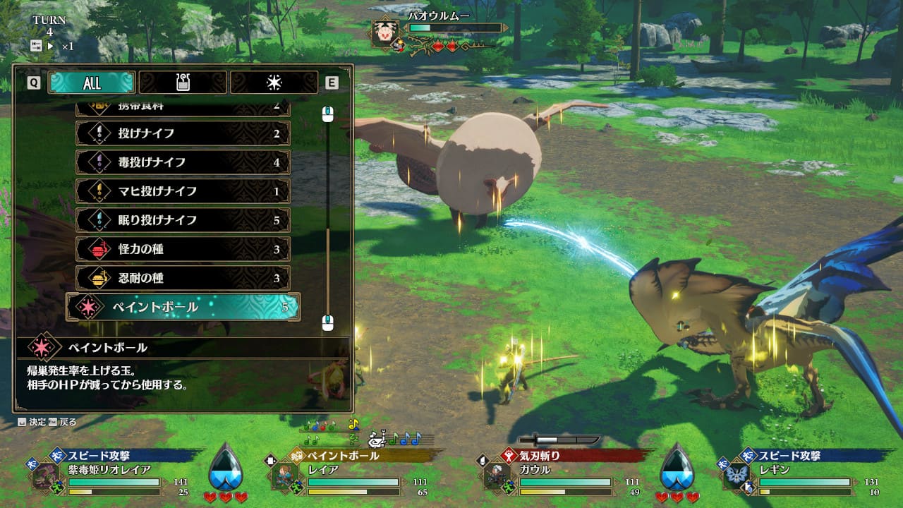 もし欲しいタマゴのモンスターとフィールド上で遭遇できるなら、戦闘を仕掛けて体力を減らし、倒す前にペイントボールを投げることで、帰巣が発生しやすくなります。モンスターが帰巣した巣からは、そのモンスターのタマゴのみが入手できるので、とても強い生命力のものをじっくり厳選できます。