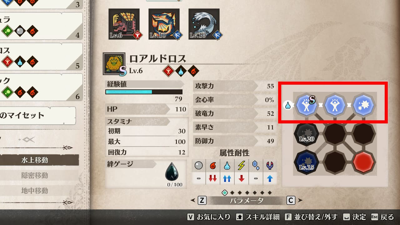 付与属性によって異なるスキルを覚えるので、お気に入りのモンスターは、様々なエリアに生態追加してランクを上げてタマゴを探してみてください。