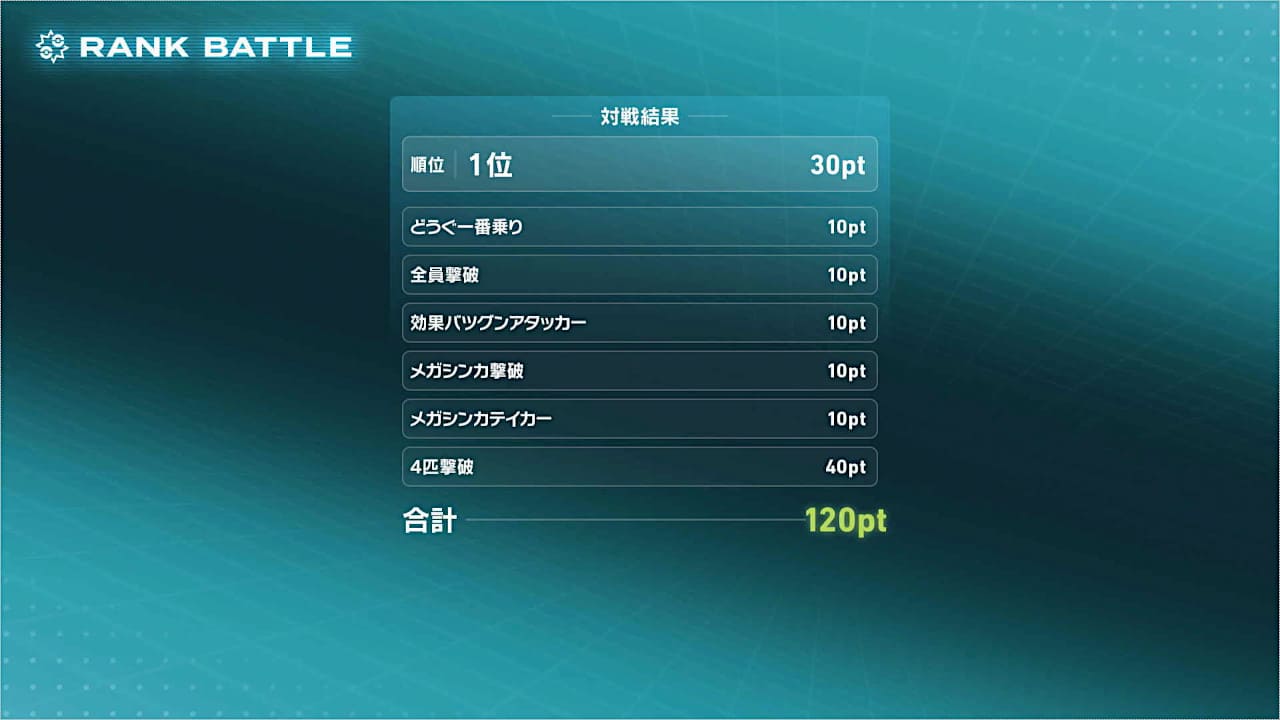 3位と4位はマイナスポイントですが、追加ポイントの獲得条件は多様です。対戦中の行動を意識して効率よくポイントを稼ぐようにしましょう。